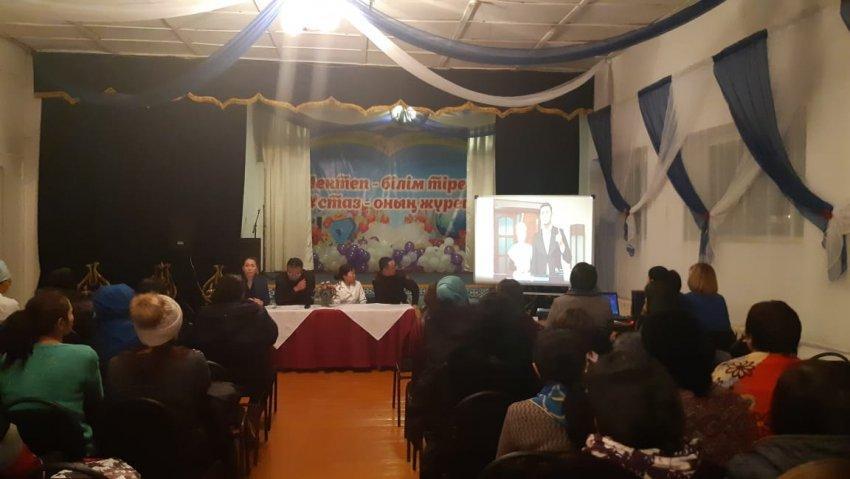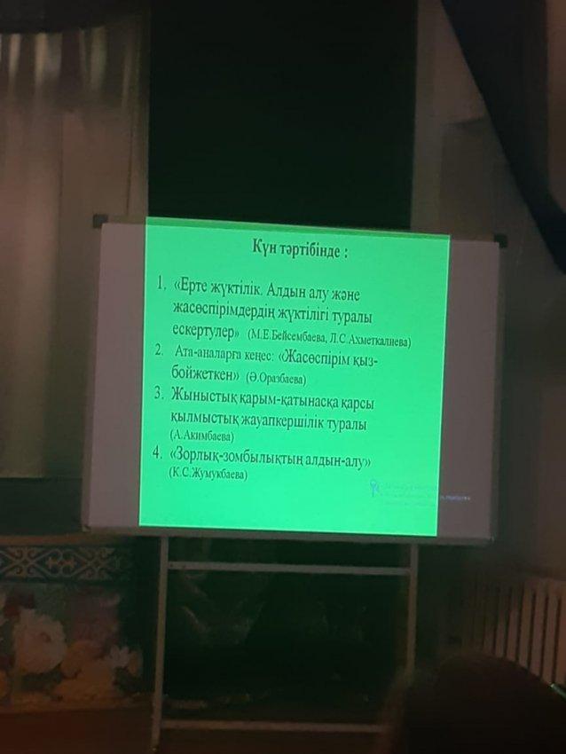 2019 жылдың 27 қарашасында мектебімізде оқушылар арасындағы гигиеналық білім мен дағдыларды қалыптастыру, оқушылармен ата-аналарды ерте жүктілікпен байланысты қауіптермен таныстыру және жасөспірімдердің денсаулығы мен өмірі үшін жауапкершілігін арттыру мақсатында «Балалар мен жасөспірімдер арасындағы жыныстық тәрбие және ерте жүктіліктің алдын алу» тақырыбында өткізілген бір күндік іс-шара жоспары құрылып жұмыс жүргізілді. «Ерте жүктілік. Алдын алу және жасөспірімдердің жүктілігі туралы ескертулер»тақырыбында 7-11 сынып қыз балалар арасында дөңгелек үстел өткізілді.Мектеп медбикесі қыздарға байланысты тиімді қасиеттерді айтып таныстырды. Қыздар өз ойларымен бөлісті. Ерте жүктілік. Алдын алу және жасөспірімдердің жүктілігі туралы ескертулер»тақырыбында мектепішілік ата-аналар жиналысы ұйымдастырылды. Жиналысқа мектеп директоры, тәрбие ісі жөніндегі меңгерушісі, жасөспірімдер инспекторы, қалалық ауруханадан акушер-гинеколог қатысты. Күн тәртібіне қойылған мәселе бойынша жауапты тұлғалар сөйледі. Слайд, видеороликтер арқылы мағлұматтар терең түсінік берді. Мектеп директоры ата-ана жауапкершілігі туралы айтты, ал тәрбие ісінің меңгерушісі оқушылардың бос уақытын қадағалап, киім киісі жеке бас тәртібіне тоқталды. Жасөспірімдер инспекторы көше тәртібі туралы тоқталып, осы уақытқа дейінгі қылмыстық істер туралы анық айтты. Акушер-гинеколог «Ерте жүктілік» неге әкелетінін, ағзаға төнетін қауіп-қасіретін айқын жеткізді.Соңғы мәселе бойынша мектеп психологы видео ролик арқылы «Зорлық-зомбылыққа қарсымыз» тақырыбын ашты. Ата-аналар балаларына деген қамқорлыққа өз ризашылығын білдіріп сөз алысты. Соңынан психологиялық ахуал орнатып аяқталмаған тезис жаттығуын орындады.