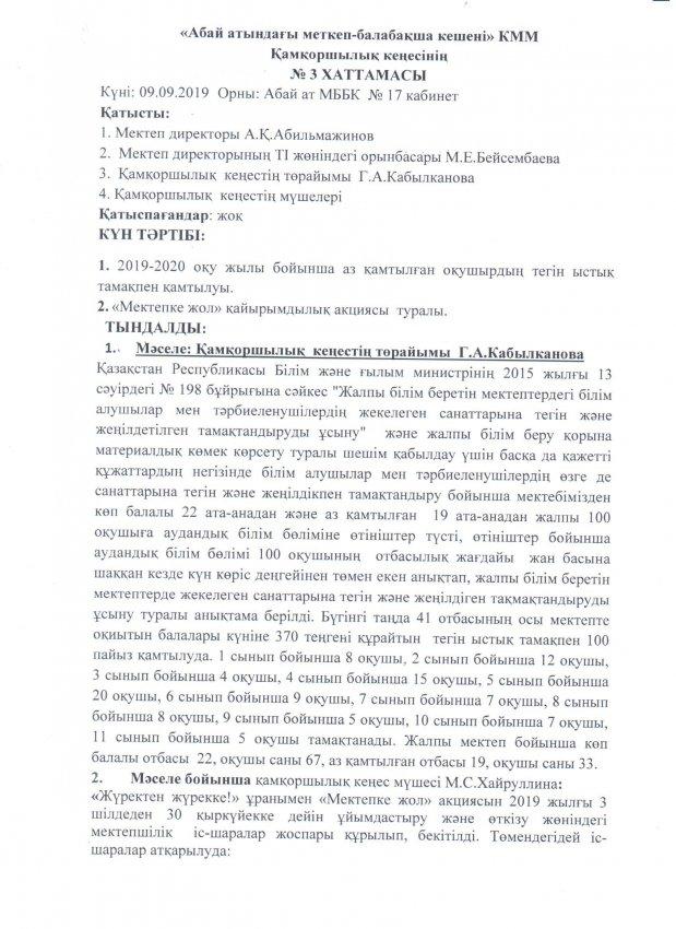 Қамқоршылық кеңес хаттама 3 » "Абай атындағы мектеп-балабақша кешені" КММ