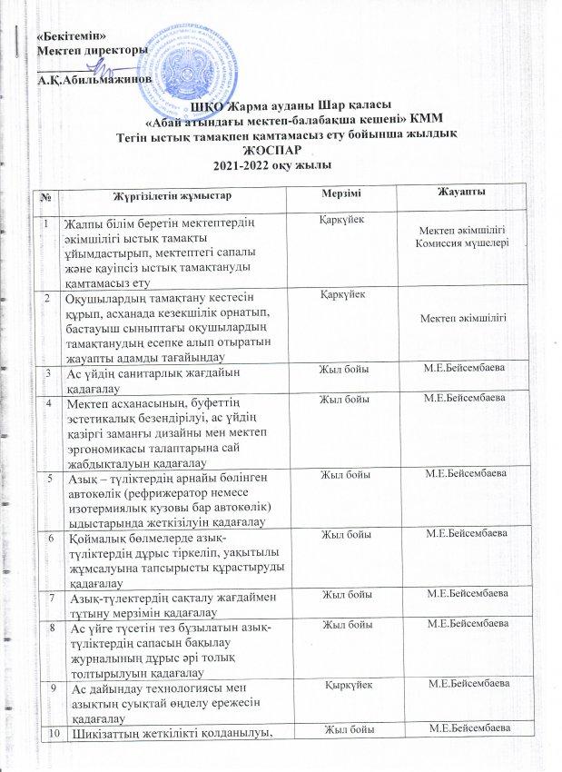 Тегін ыстық тамақпен қамтамасыз ету бойынша жылдық жұмыс жоспары » "Абай атындағы мектеп-балабақша кешені" КММ