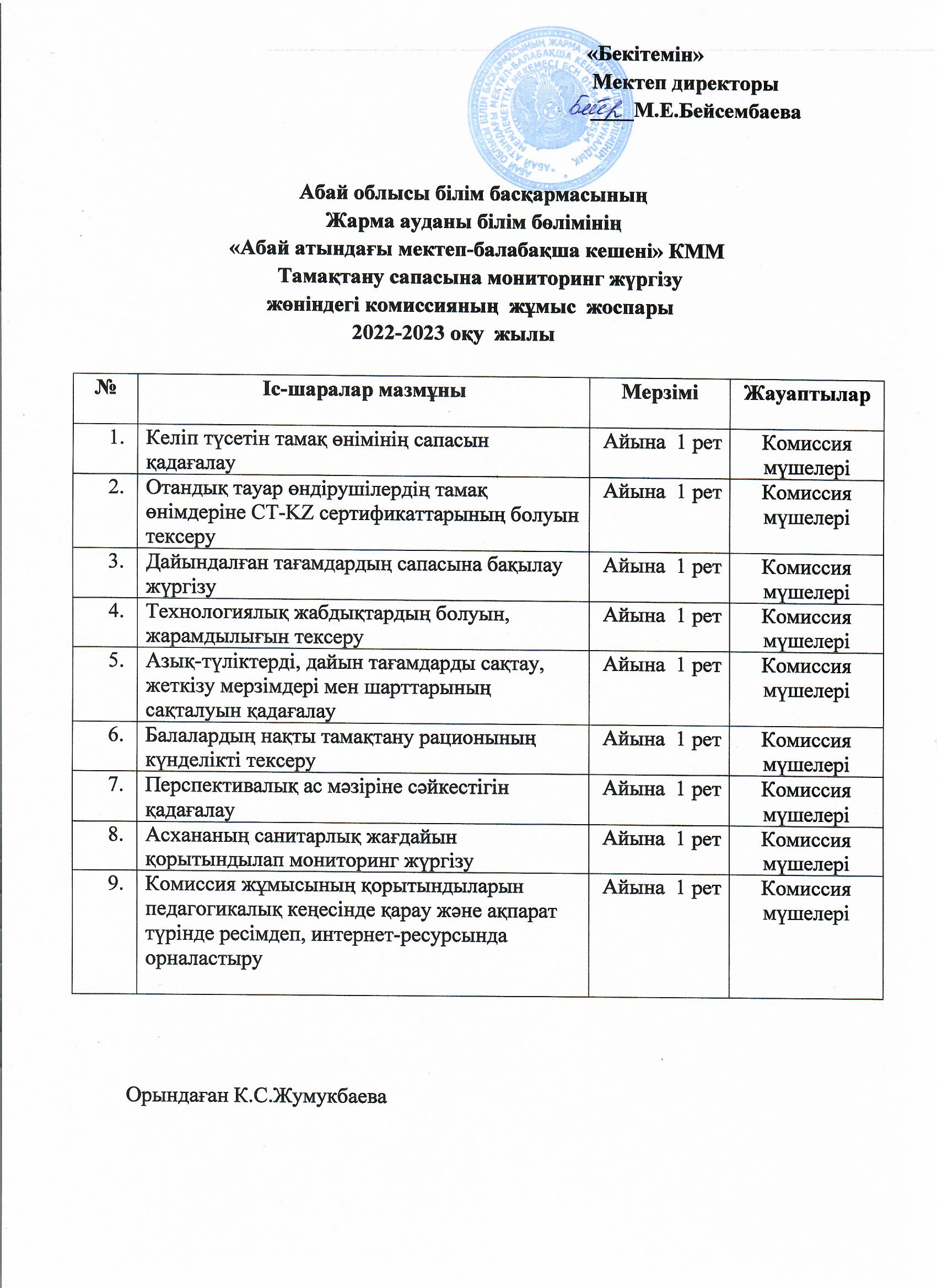04 октябрь 2022 0 1 2 3 4 5 Тамақтану сапасына мониторинг жүргізу жөніндегі комиссияның жұмыс жоспары 2022-2023 оқу жылы Казан