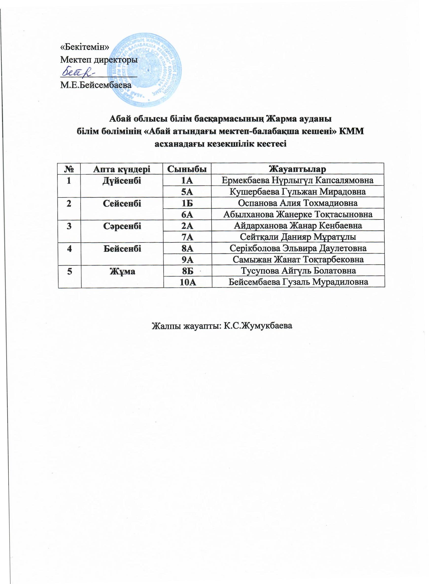 Асханадағы кезекшілік кестесі 2022-2023 оқу жылы Қазан » "Абай атындағы мектеп-балабақша кешені" КММ
