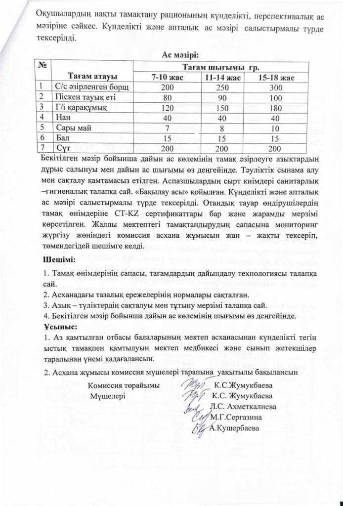 Тамақтандырудың сапасына мониторинг жүргізуін тексерудің қорытындысы » "Абай атындағы мектеп-балабақша кешені" КММ