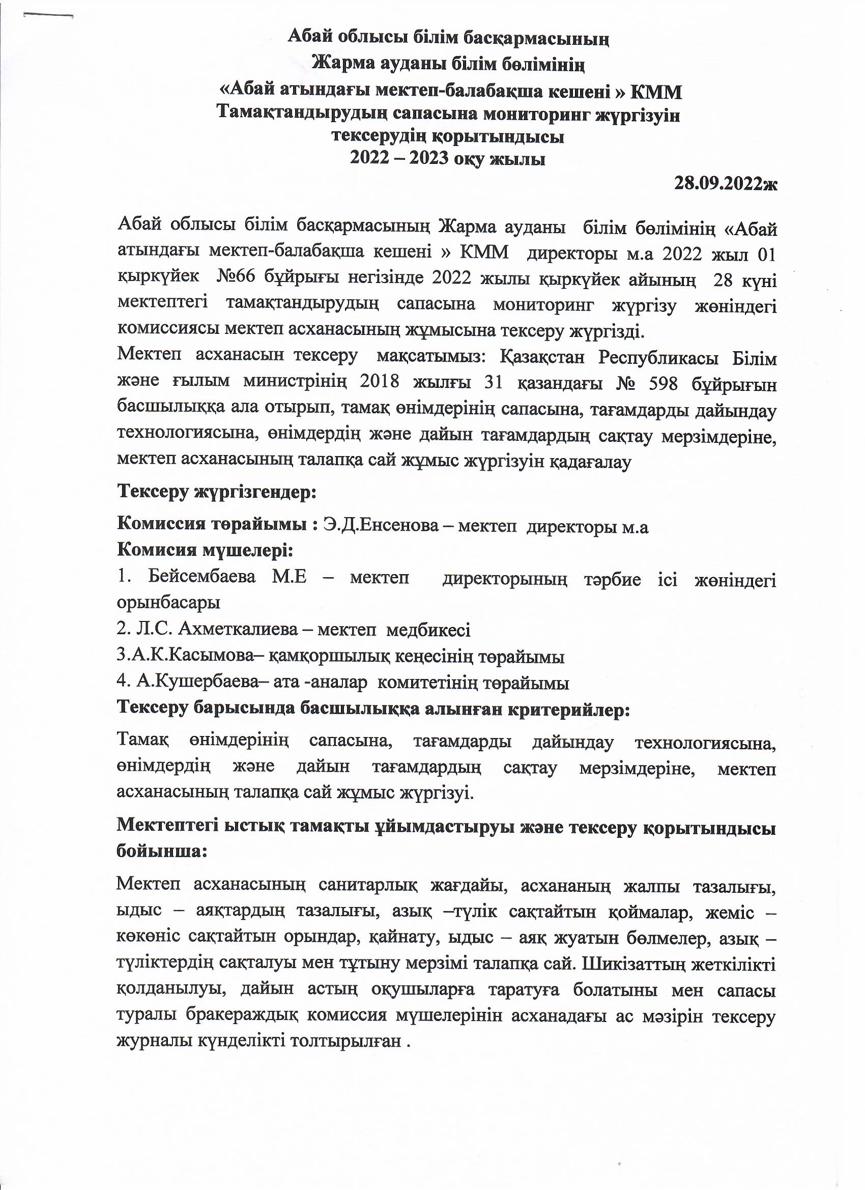 29 сентябрь 2022 0 1 2 3 4 5 Тамақтандырудың сапасына мониторинг жүргізуін тексерудің қорытындысы 2022 – 2023 оқу жылы [center][medium]http://abai-
