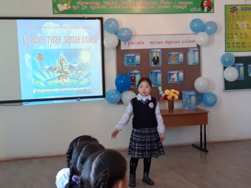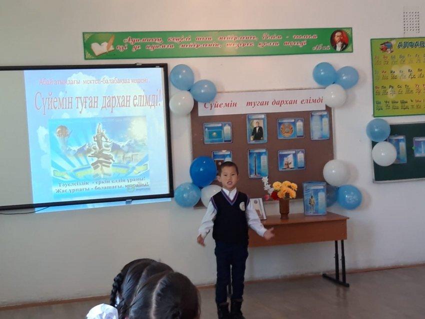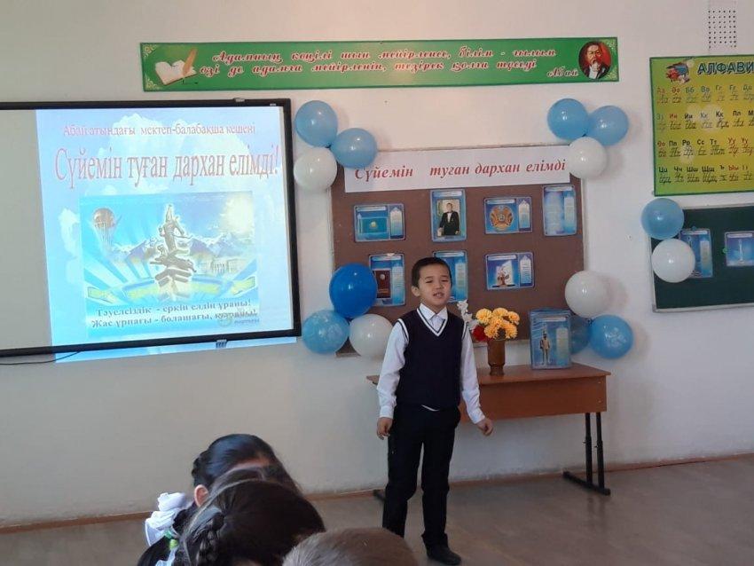Барлығы -19 оқушы қатысты.Олар Отан, туған жер туралы өлеңдерін үш тілде мәнерлеп оқыды.Сайыс барысында «Тәелсіздік шежіресі», «Тәуелсіздік ата-бабам аңсаған» слайдтары мен «Мен өз елімнің патриотымын!» атты бейне ролик көрсетілді.3 «А» сынып оқушысы Адилахим Мұхамед «Қазақстан бақыты» әнін орындады.Ең үздік, мәнерлеп оқыған оқушылар марапатталды. Олар:Қазақ тілінен: І орын Рыспек Азиз 1 «А» сынып оқушысы, Тугушева Аяулым ІІ орын 4 «А» сынып оқушысы, Ахмет Ерсұлтан ІІІ орын 2 «А» сынып оқушысы.Орыс тілінен: Амангелді Дария 3 «А» сынып оқушысы ІІІ орын, Рапиева Альбина 4 «Б» сынып оқушысы ІІ орын, 4 «Б» сынып оқушысы ІІ орын. Ағылшын тілінен: Ибраим Жігер 2 «Б» сынып оқушысы ІІІ орынды иеленді.