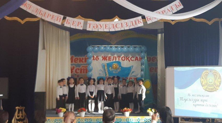 13.12.2018 жылы «Желбірей бер тәуелсіздік байрағы» тақырыбында салтанатты мерекелік кеш өтті. Кеште оқушылар өздерінің шығармашылық қабілеттерін танытып, белсенділік көрсетті. Даярлық топ тәрбиеленушілері «Тәуелсіз ел ұраным!» әнін хормен айтса , 1-4 сынып оқушылары әдеби-монтаж, 9-10 сынып оқушылары «Тәуелсіздік тарихына шолу» тақырыбында көрініс қойып, 2 а сынып оқушысы Адилахим Мұхамед және Жаңбырбаев Нұржігіт «Қазақстан бақытты », 10 сынып оқушылары Кушербаева Карина мен Аркашева Алуа «Қазақстаным алға » әнімен ән шашу шашты. Сонымен қатар, желтоқсан оқиғасы баяндалатын бейне жазба көрсетіліп, қазақ биі биленіп, тақырыптық әндер айтылды.