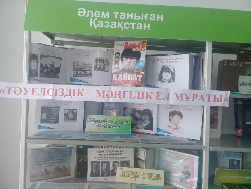 09.12.2019 жылы мектеп кітапханасында «Тәуелсіздік-Мәңгілік ел мұраты» тақырыбында кітап көрмесі ұйымдастырылды. Кітапханада еліміздің тәуелсіздік алған сәтінен бастап бүгінге дейінгі жүріп өткен жолы туралы еңбектері және тәуелсіздік жылдарында баспадан шыққан әдебиет туындыларымен қамтылған кітап көрмесі жасалды. Көрменің басты мақсаты: Ата - бабамыздың тәуелсіздік жолындағы ерлігін үлгі етіп, Тәуелсіздік алғаннан кейінгі Қазақстанның дербес мемлекет ретінде қалыптасу тарихына шолу жасау, тұңғыш Президент Н.Ә.Назарбаевтың кемел саясаты мен ерен еңбегі арқасында еліміздің жеткен жетістіктері мен рухани игі өзгерістер белесін көпшілікке таныту. Көрмеде еркіндікті аңсап, азаттықты көксеумен келе жатқан еліміздің тарихын баяндайтын саяси күресі, Тұңғыш Президенттің ғибратты ғұмыры, елмен етене өмірі, еліміздің егемендікке жету жолы, мемлекет құру, экономикасы қуатты, саясаты тұрақты, ынтымақшыл ел жасау жолындағы қасиетті тарихымыз, мемлекет басшысының «Болашаққа бағдар: рухани жаңғыру» атты бағдарламалық мақаласының мақсаты мен мүддесін айқындайтын әдеби туындылар қойылған.