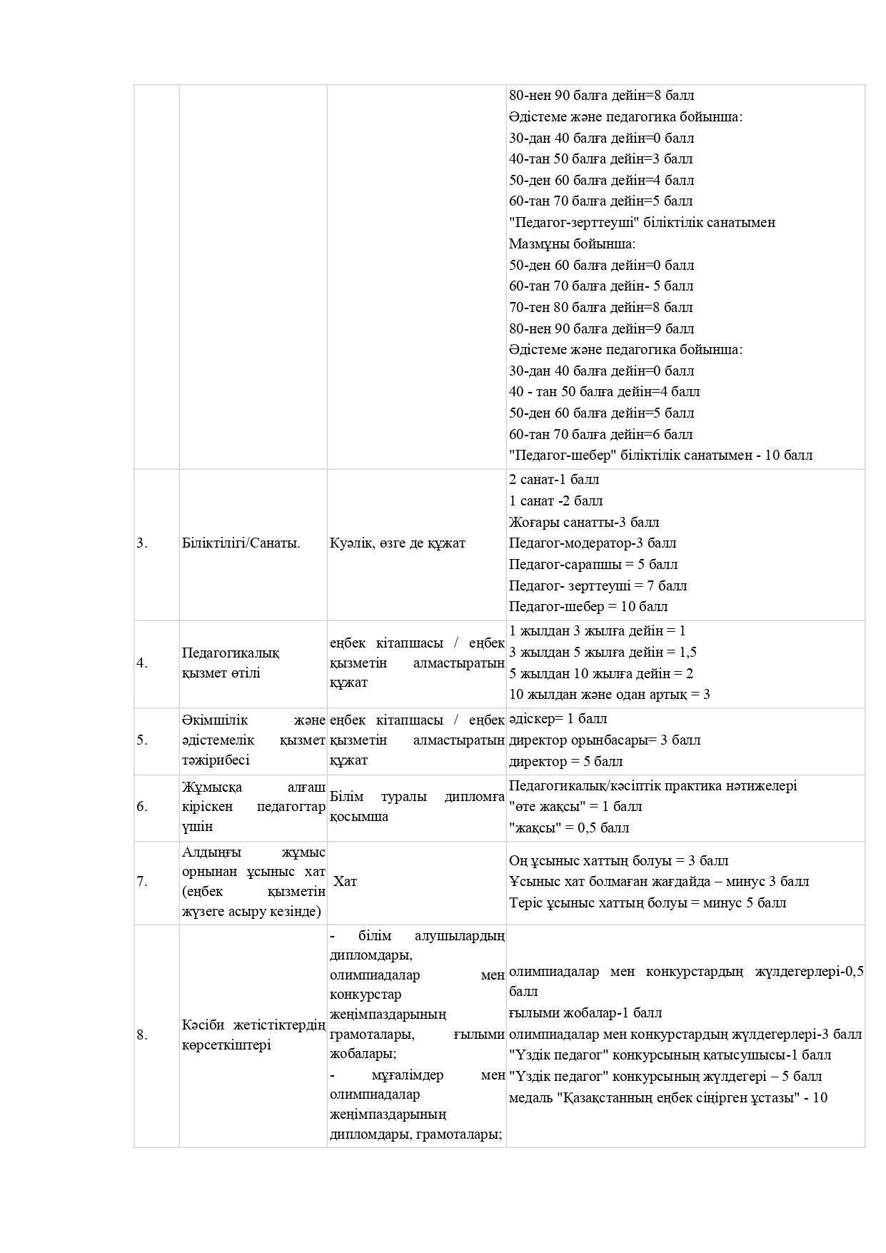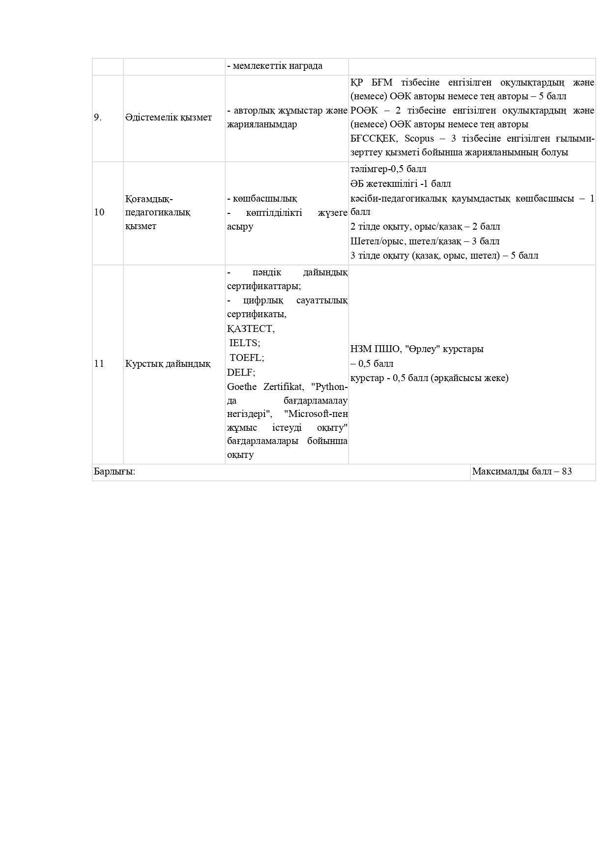 9. Ұлттық біліктілік тестілеу сертификаты немесе педагог-модератордың, педагог-сарапшының, педагог-зерттеушінің, педагог-шебердің біліктілік санатының болуы туралы куәлік( болған жағдайда).