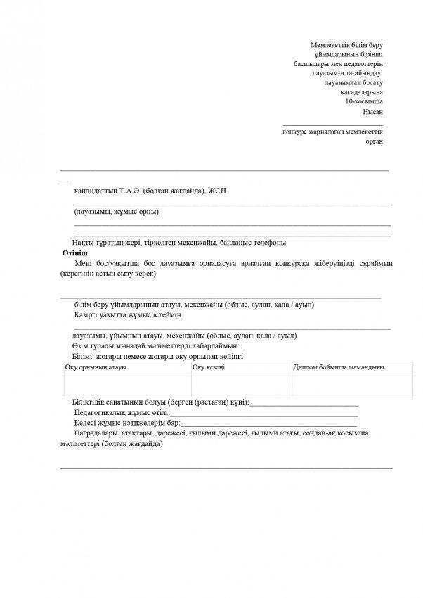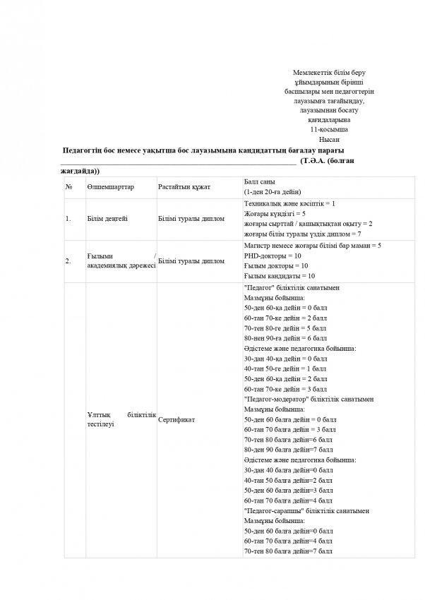 10. 11-қосымшаға сәйкес нысан бойынша педагогтің бос лауазымына кандидаттың толтырылған бағалау парағы.